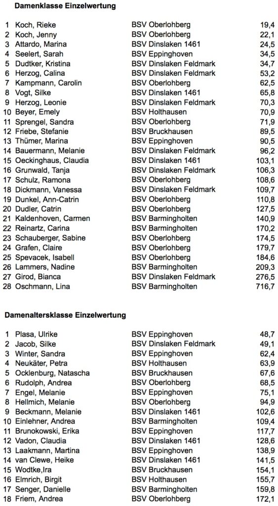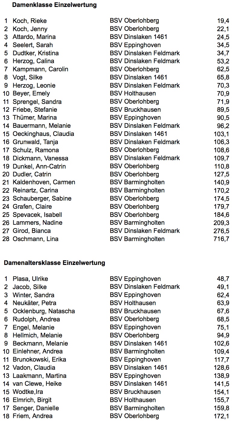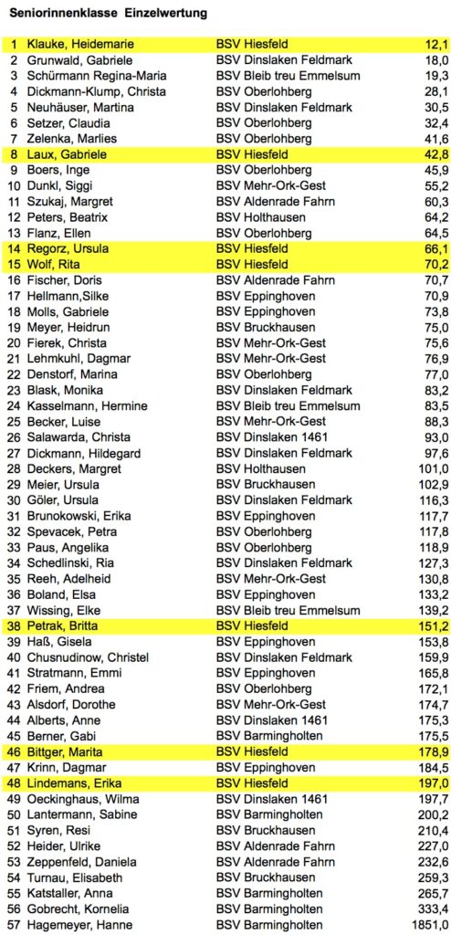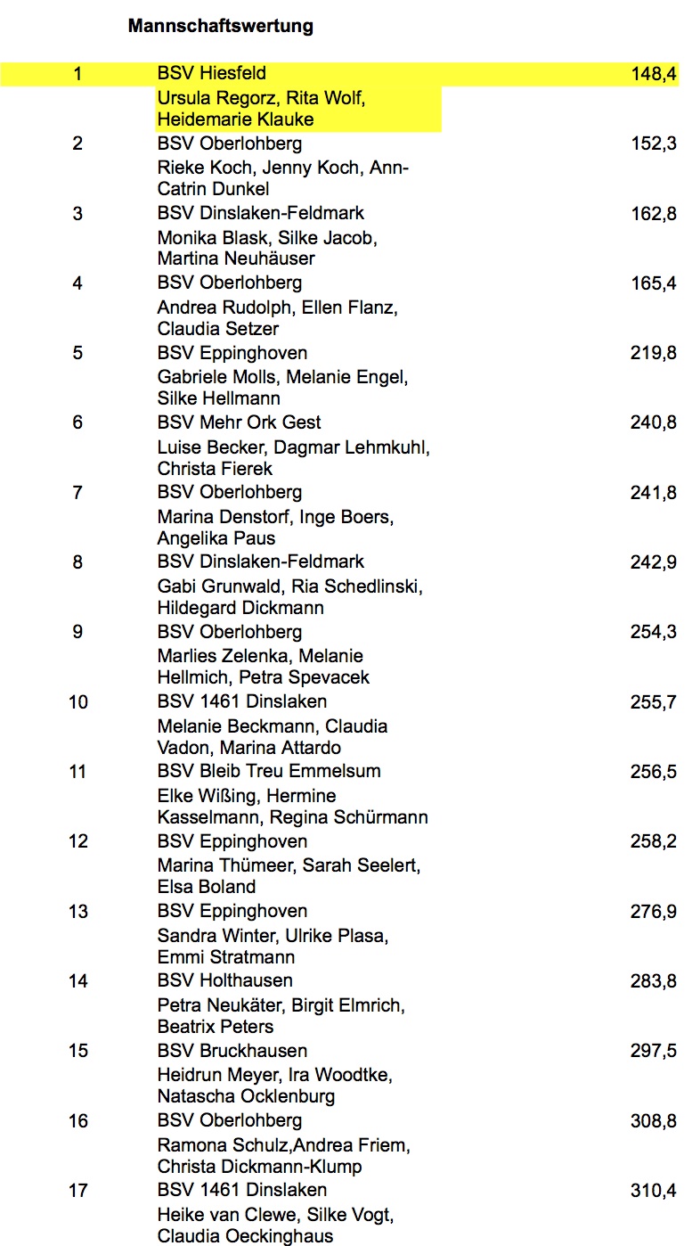Und davon hatten die 7 Hiesfelder Damen genug. Allen voran Heidemarie Klauke, die mit dem niedrigsten Teiler aller Altersklassen den 1. Platz bei den Seniorinnen belegte. Gleichzeitig verteidigten Heidemarie Klauke, Ursula Regorz und Rita Wolf mit knappem Vorsprung ihren Vorjahrestitel. Herzlichen Glückwunsch!